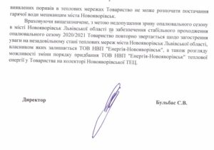 Враховуючи вищезазначене, з метою недопущення зриву опалювального сезону в місті Новояворівськ Львівської області та забезпечення стабільного проходження опалювального сезону 2020/2021 Товариство повторно звертається щодо загострення уваги на незадовільному стані теплових мереж міста Новояворівськ Львівської області, власником яких залишається ТОВ НВП “Енергія-Новояворівськ”, а також розгляду можливості зміни порядку придбання ТОВ НВП “Енергія-Новояворівськ” теплової енергії у Товариства на колекторі Новояворівської ТЕЦ.