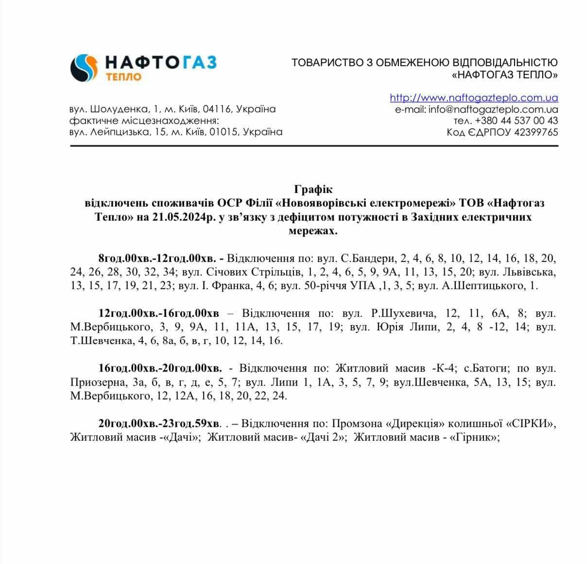 Повідомляємо, що длдя виконання робіт передбачених інвестеційною програмою товариства, в період з 15.06.2023 по 29.06.2023 з 9:00 до 16:00 буде відключення електричної енергії по вулицям Січових Стрільців та Довбуша в м.Новий Розділ