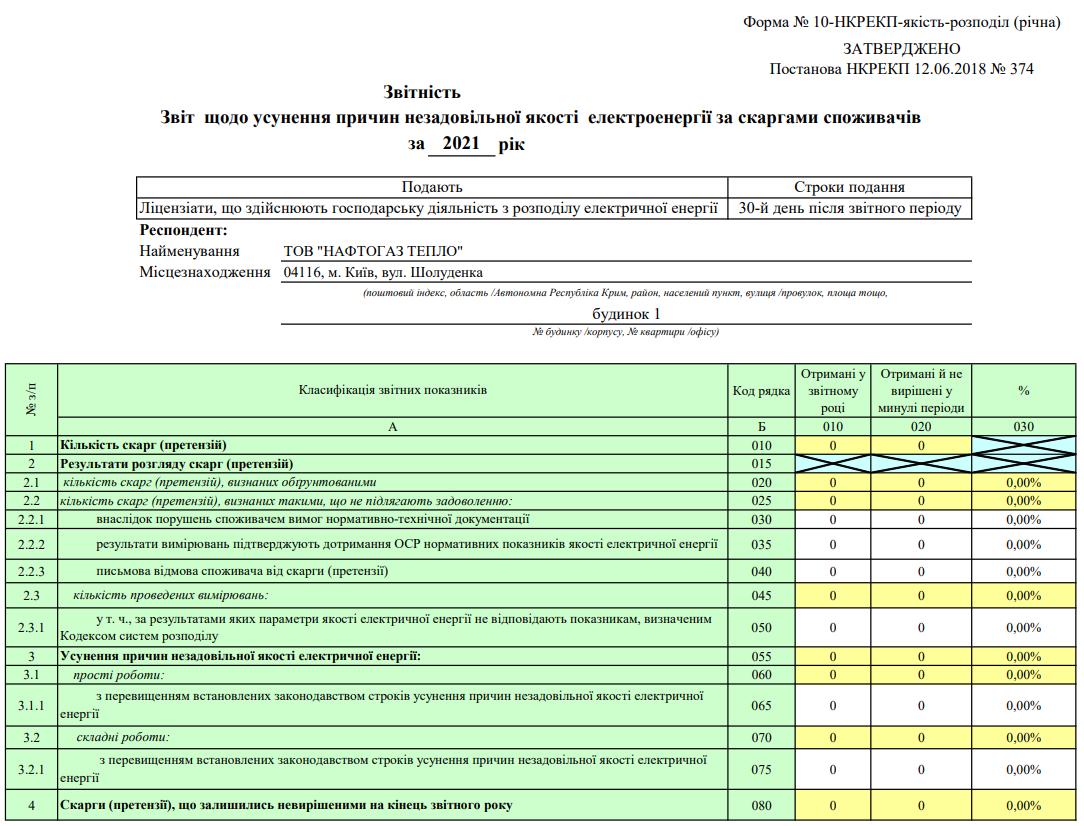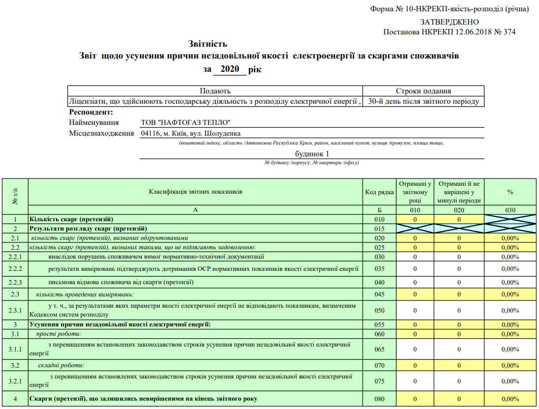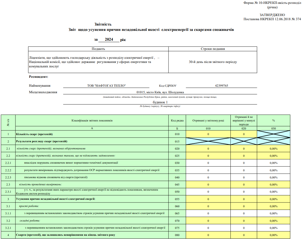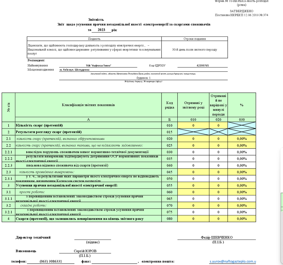 Звіт щодо усунення причин незадовільної якості електроенергії за скаргами споживачів